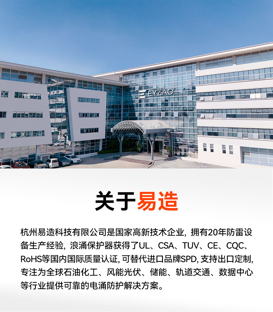 易造T1級(jí)浪涌保護(hù)器12.5kA-100kA規(guī)格型號(hào)齊全,嚴(yán)格執(zhí)行國(guó)內(nèi)國(guó)際各項(xiàng)標(biāo)準(zhǔn),獲得了UL、CSA、TUV、CE、CQC等多項(xiàng)權(quán)威認(rèn)證,確保了易造SPD在各種環(huán)境下的適用性和可靠性,可廣泛應(yīng)用于軌道交通、石油化工、港口碼頭、風(fēng)力發(fā)電、儲(chǔ)能系統(tǒng)、冶金、機(jī)場(chǎng)、醫(yī)院、煙草、市政等行業(yè)領(lǐng)域。