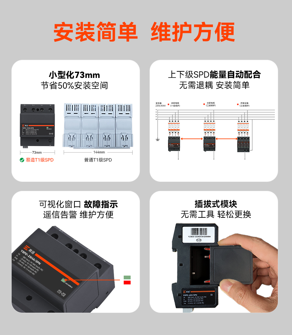 易造YSPD系列一級、二級、三級電涌保護(hù)器將安全和創(chuàng)新出色地融合在一起,采用突破性MG復(fù)合型技術(shù),解決了傳統(tǒng)SPD的短板缺陷,無續(xù)流無漏電流,延長了SPD使用壽命并提高了供電效率;易造SPD小型化設(shè)計,每相寬度僅一個模數(shù)(18mm),使配電箱的空間更充裕,并具有本地及遠(yuǎn)程告警功能,維護(hù)方便;靈活的鏈?zhǔn)椒烹娂夹g(shù)簡化了SPD的安裝方式,上下級SPD能量自動配合,無需退耦器,顯著提升了電涌保護(hù)效率和TOV耐受能力,確保供電系統(tǒng)的穩(wěn)定性。