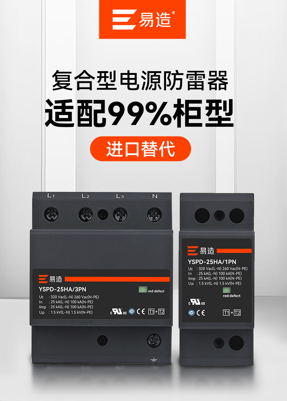 易造YSPD系列一級(jí)、二級(jí)、三級(jí)電源防雷器將安全和創(chuàng)新出色地融合在一起,采用突破性MG復(fù)合型技術(shù),解決了傳統(tǒng)SPD的短板缺陷,無(wú)續(xù)流無(wú)漏電流,延長(zhǎng)了SPD使用壽命并提高了供電效率;易造SPD小型化設(shè)計(jì),每相寬度僅一個(gè)模數(shù)(18mm),使配電箱的空間更充裕,并具有本地及遠(yuǎn)程告警功能,維護(hù)方便;靈活的鏈?zhǔn)椒烹娂夹g(shù)簡(jiǎn)化了SPD的安裝方式,上下級(jí)SPD能量自動(dòng)配合,無(wú)需退耦器,顯著提升了電涌保護(hù)效率和TOV耐受能力,確保供電系統(tǒng)的穩(wěn)定性。